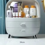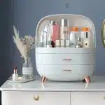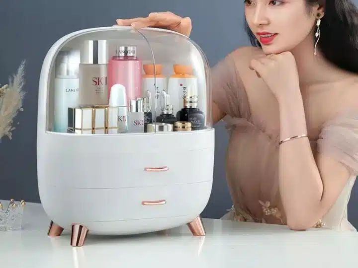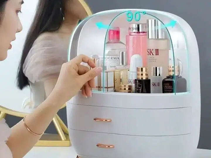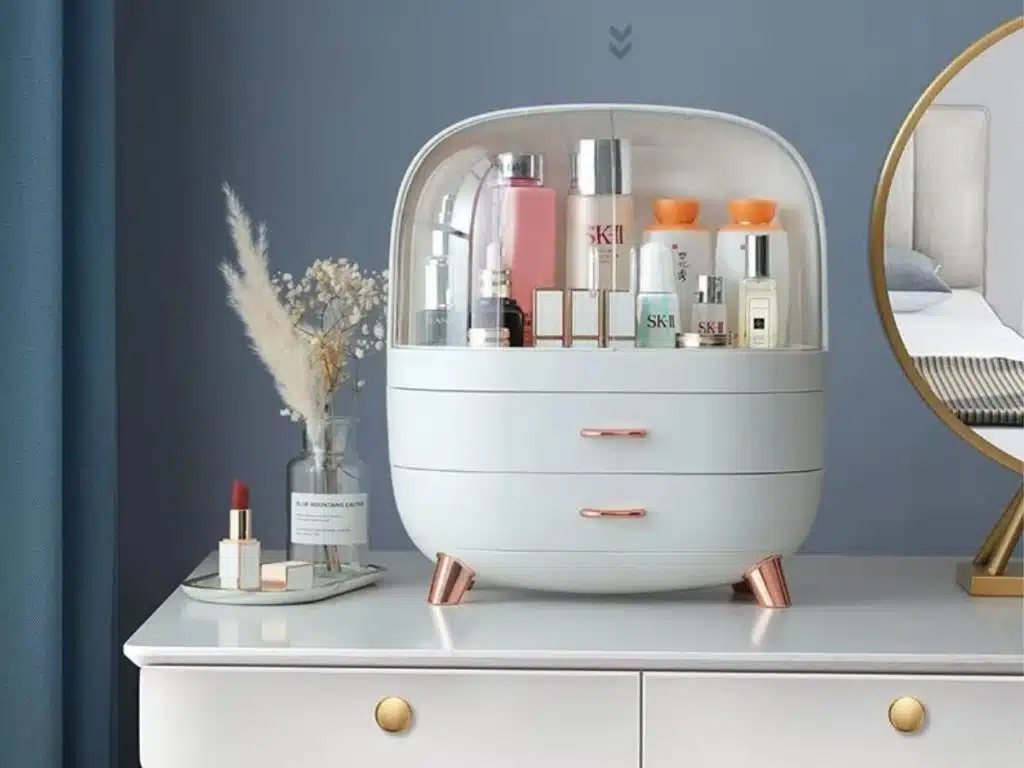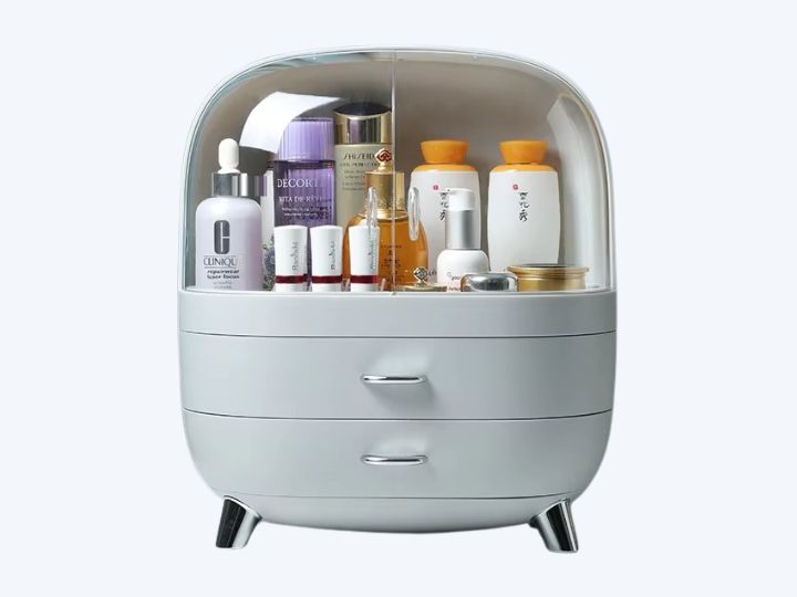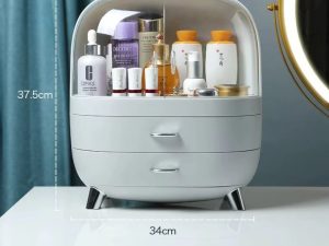 Fabriquée en plastique ABS et PS résistant, elle supporte un usage quotidien tout en restant légère et facile à déplacer. La partie supérieure, protégée par un double couvercle transparent, accueille facilement les flacons de soins, parfums, lotions ou brumes pour le corps. Les portes coulissantes permettent de voir le contenu en un coup d’œil et d’attraper rapidement le produit souhaité, tout en le mettant à l’abri de la poussière et des éclaboussures d’eau.
