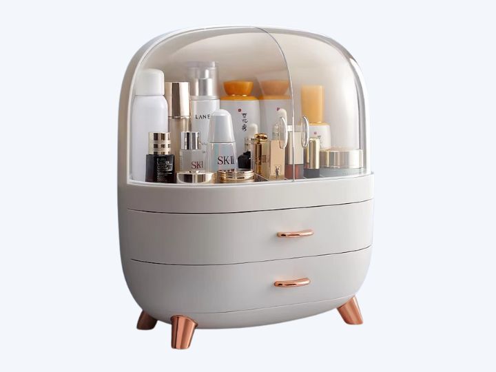 Cette boîte de rangement pour cosmétiques a été pensée pour offrir une solution élégante et fonctionnelle à toutes celles qui souhaitent garder leurs produits de beauté parfaitement organisés. Son design arrondi, posé sur de petits pieds métalliques, apporte une touche moderne à la chambre, à la salle de bain ou à la coiffeuse.
